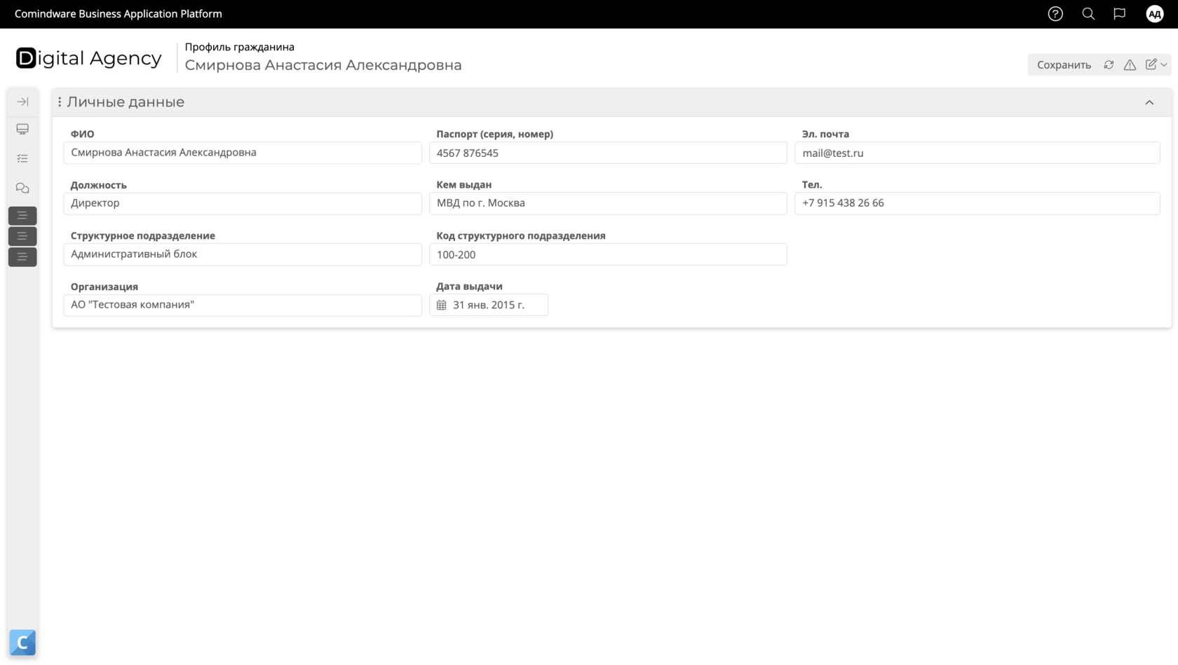 заполнение профиля граждана: ФИО, email, почта, телефон, паспортные данные