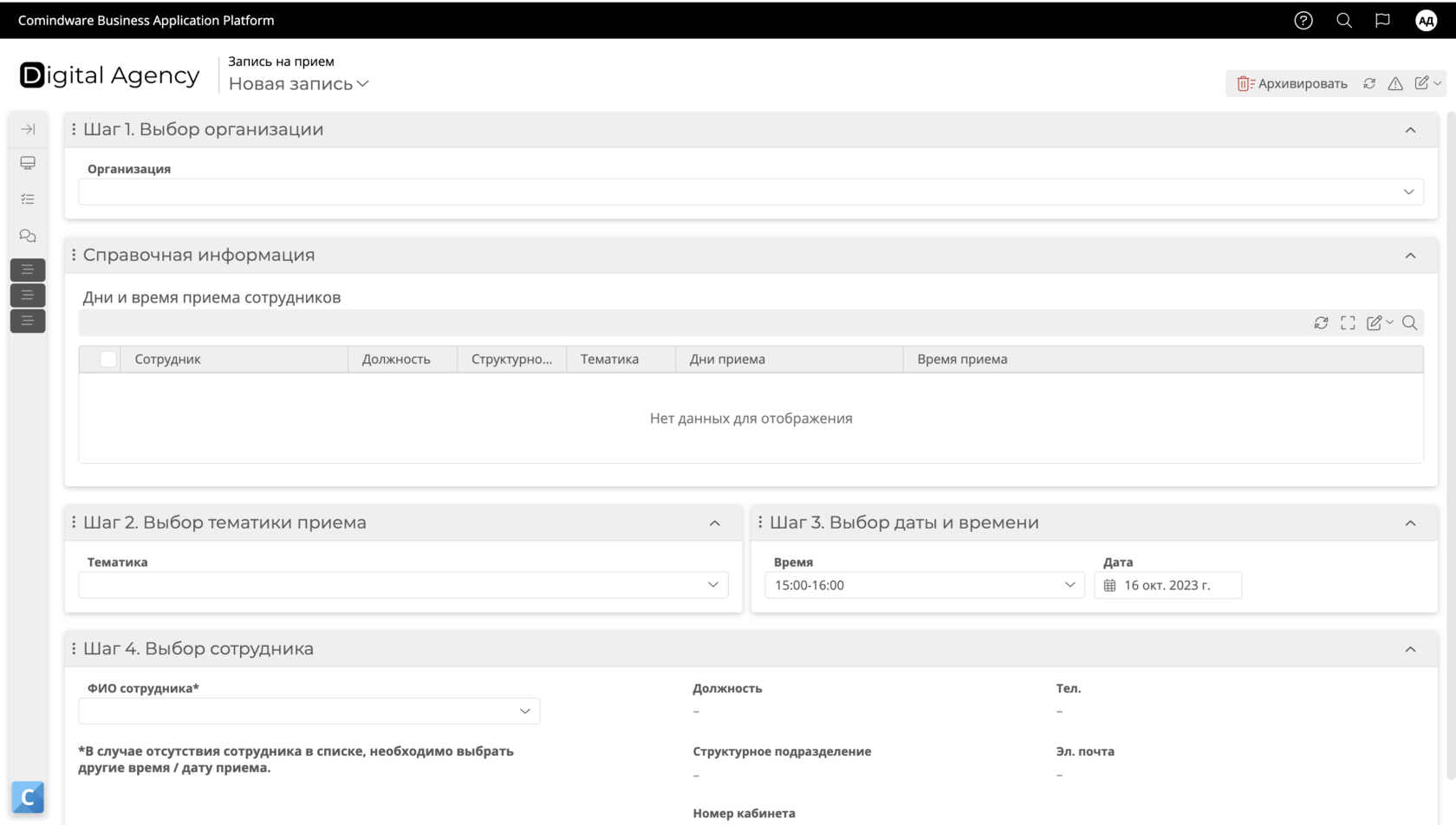 Выбор организации, тематики, даты и времени приема